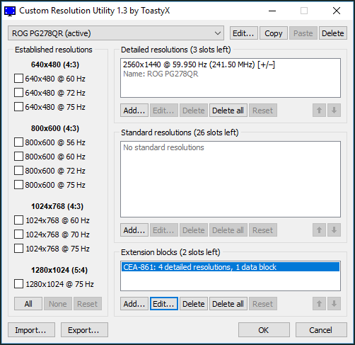 IMPORTANT: Begin by turning off ULMB and switch to a different refresh rate (e.g. 144 Hz) than the one you will modify (e.g. 100 Hz). Don’t switch to 60 Hz yet. This avoids mid-modification issues that may require Safe Mode to fix.