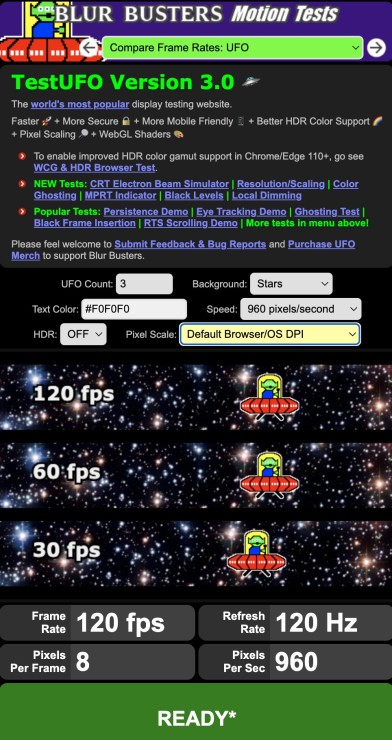 Several TestUFO screens now have discreet information panels that appears when you click on certain setting names. The popular TestUFO Ghosting test has been updated with helpful new instructions for display reviewers and content creators who use this popular test.