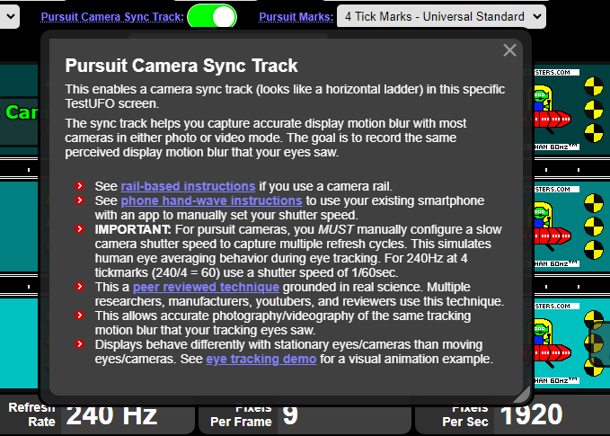 Several TestUFO screens now have discreet information panels that appears when you click on certain setting names. The popular TestUFO Ghosting test has been updated with helpful new instructions for display reviewers and content creators who use this popular test.