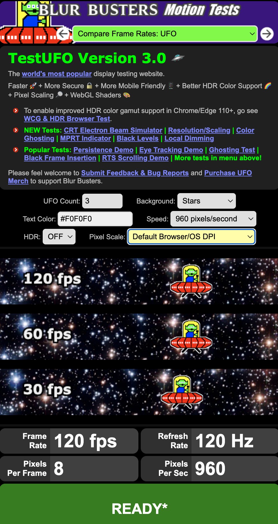 Displays on the market have reached 600 to 720 Hz, and new displays with 1000 Hz refresh rates are hitting the market. Fortunately, TestUFO has been tested to over 25,000fps in undocumented VSYNC OFF tests!