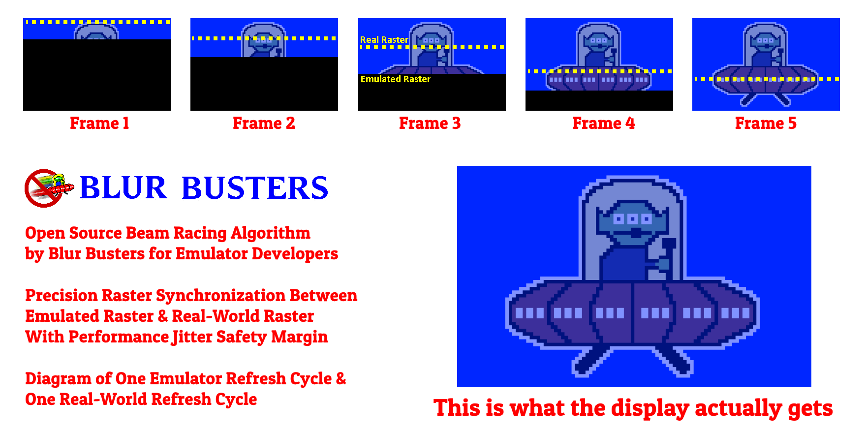 By knowing your computer’s exact VBI size to the microsecond — using standard API calls — it is possible to begin beam racing only a few scanlines ahead of a real raster, and go to huge number of frame slices (even 100+) instead of just a few frame slices.