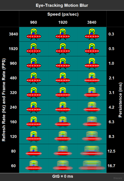 Keep in mind that the Blur Busters Law primarily applies to eye-tracking motion blur – the kind we notice when our eyes follow moving objects across the screen. It doesn’t necessarily describe other scenarios. There are also other conditions that must be met for the law to be applicable – no GtG or phosphor limitations, frame rate = refresh rate, single pulse per frame. To learn more, refer to Blur Busters website or forums.