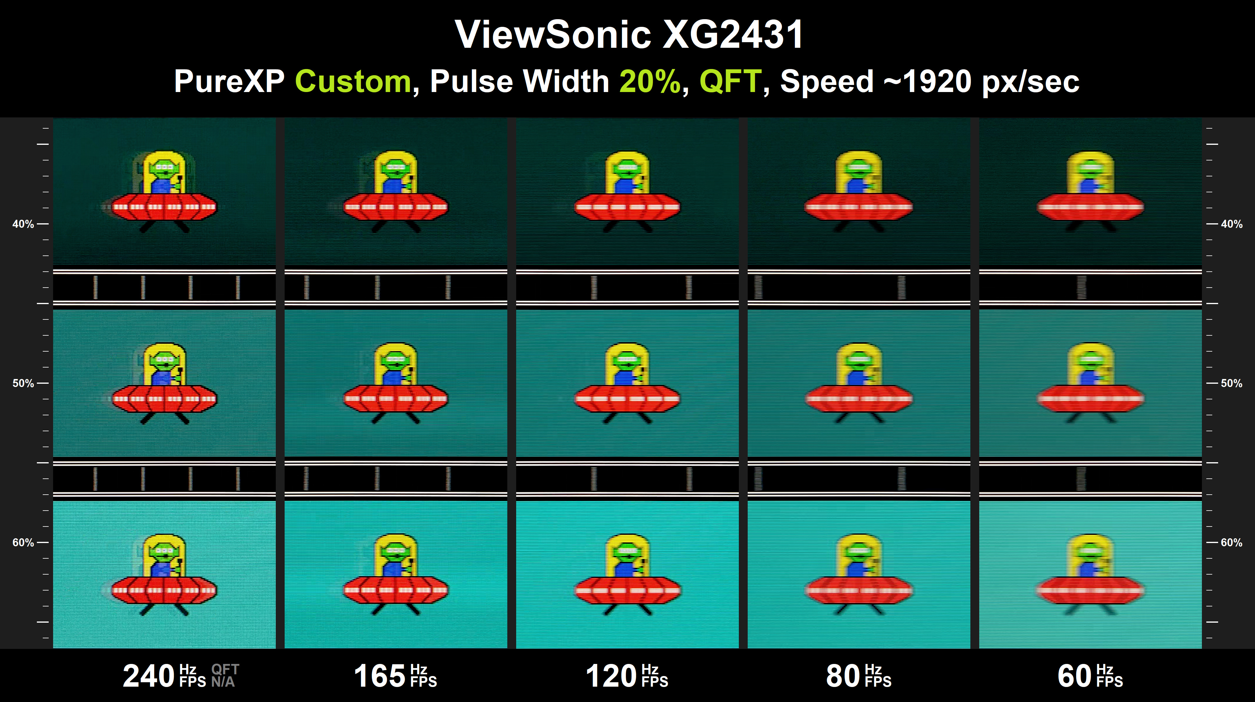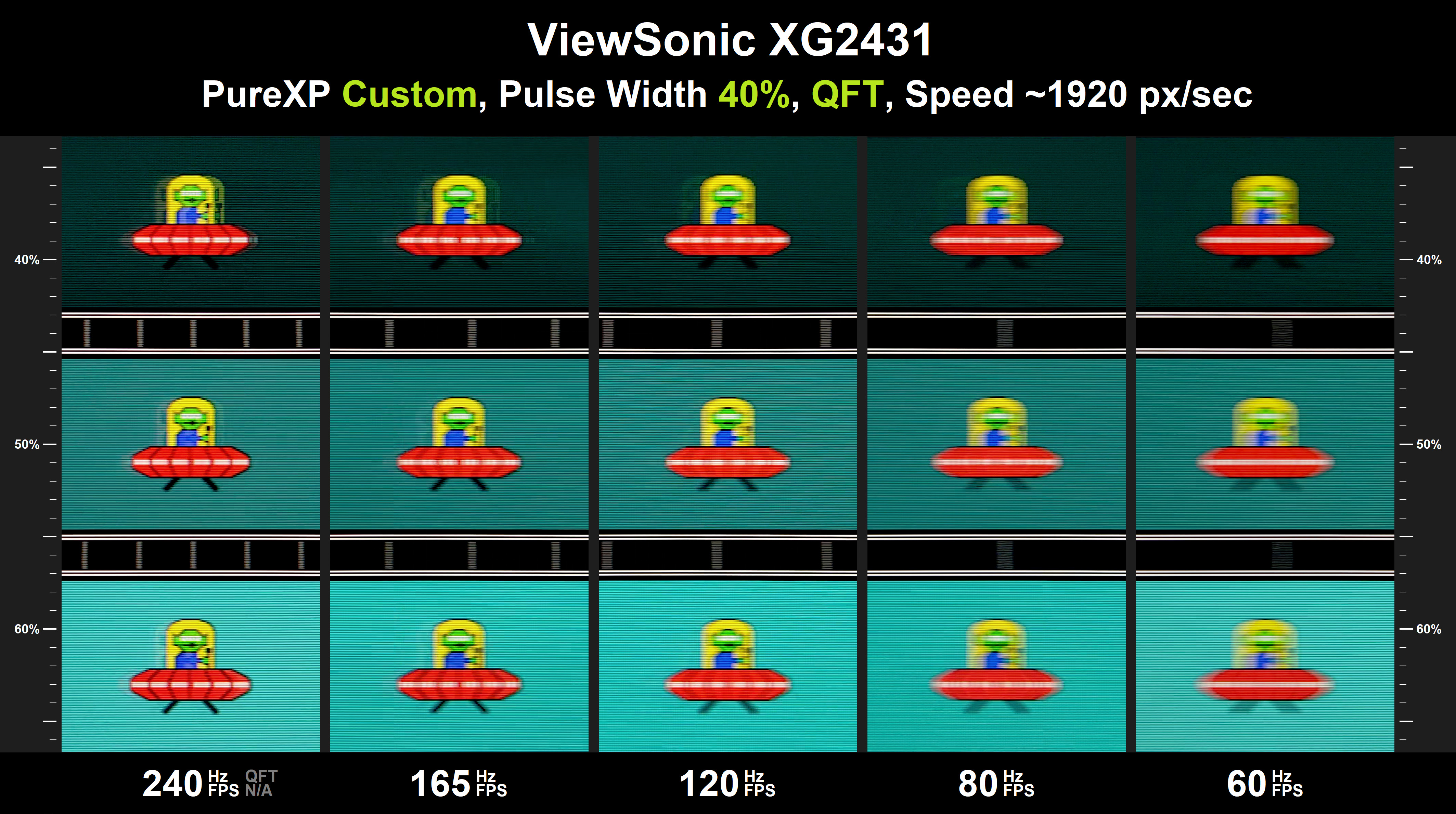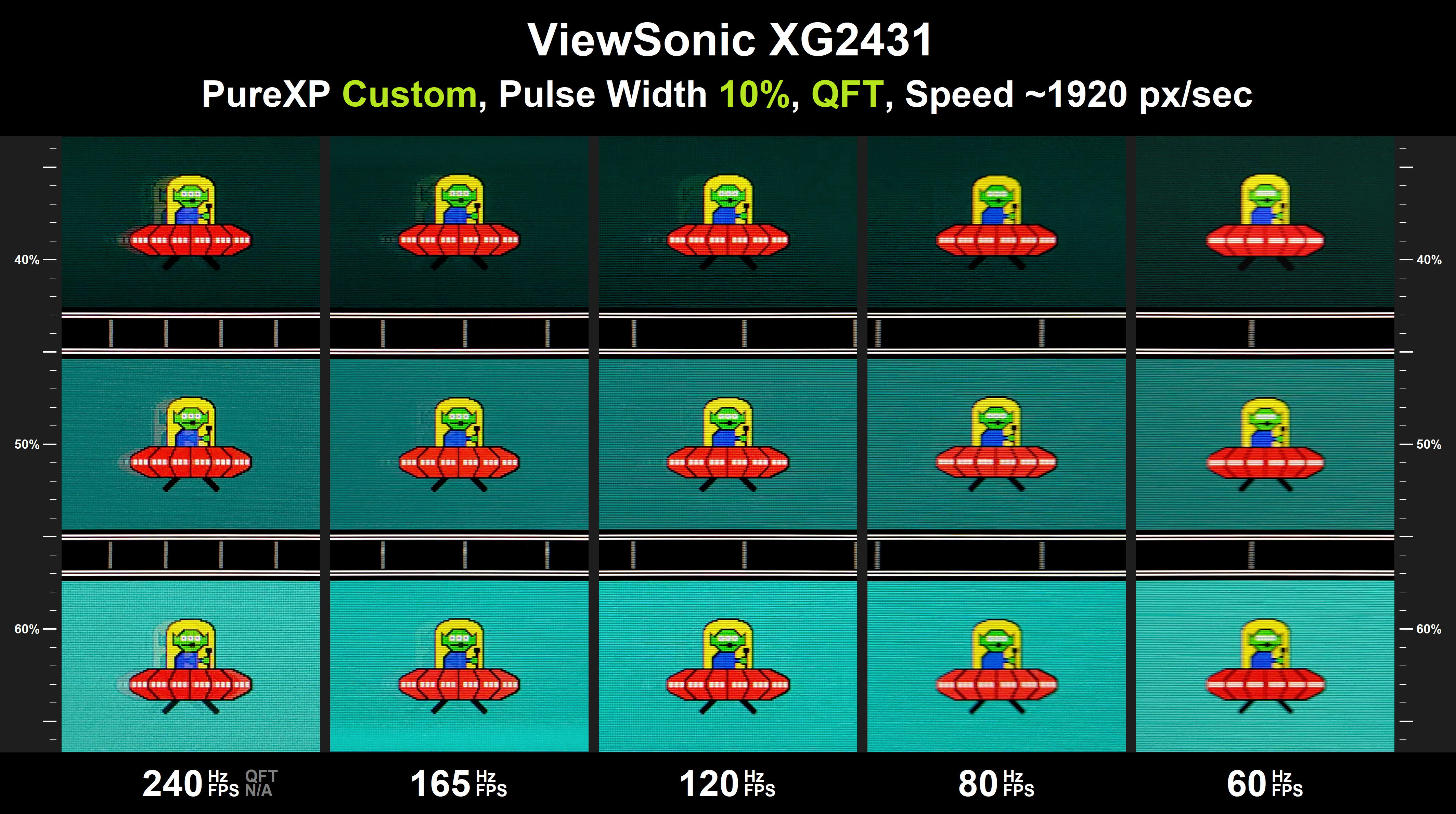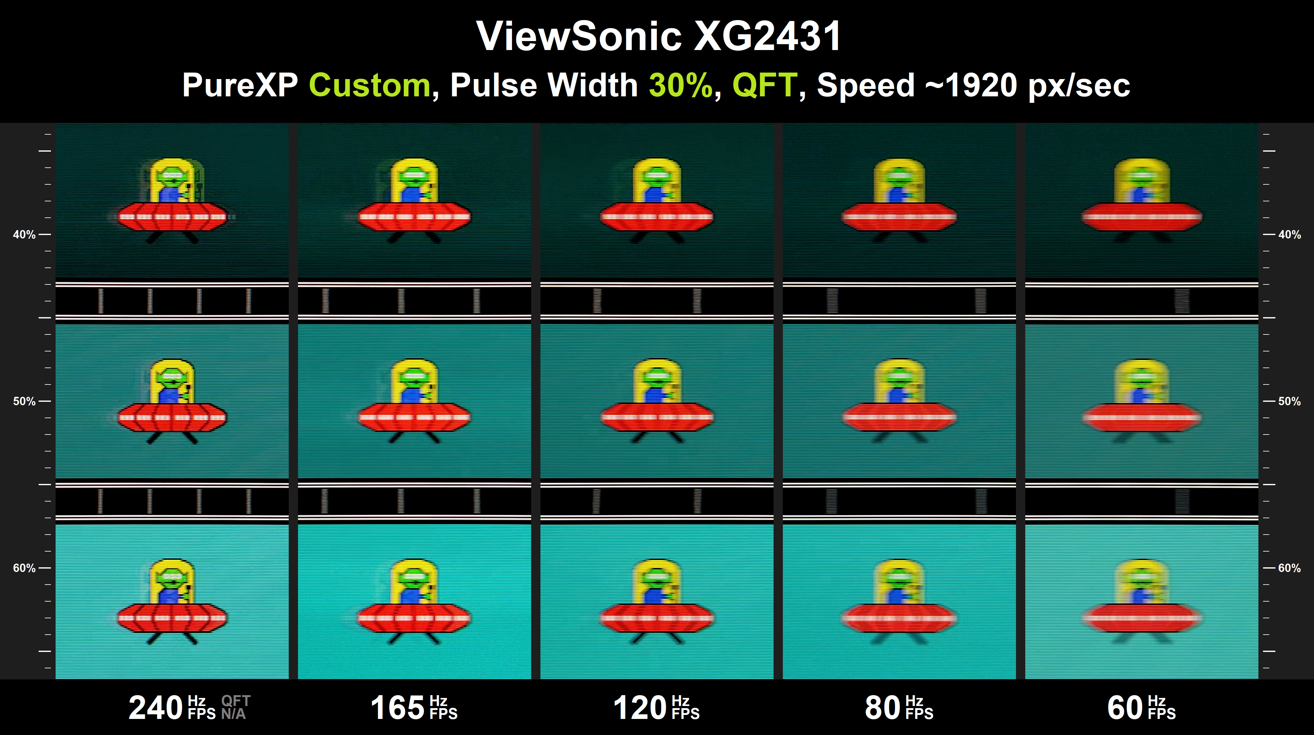 Having said that, you may want to increase the moving speed to see improvements of tinier pulse widths/MPRT. On TestUFO at default ~1000 px/sec speed anything sub 1 ms MPRT won’t be very visible because it’s too slow. At 240 Hz all pulse widths up to 24% will make no difference persistence wise at that speed; You will need larger than 24000-600 px/sec to spot the difference. Decreasing refresh rates will help too. At 60 Hz all the way down to 6% will be spotable and minimum speeds would drop to 6000-150 px/sec. That’s how much speed XG2431 can handle without motion breaking apart. For convenience reasons ~2000 px/sec may be more comfortable.
