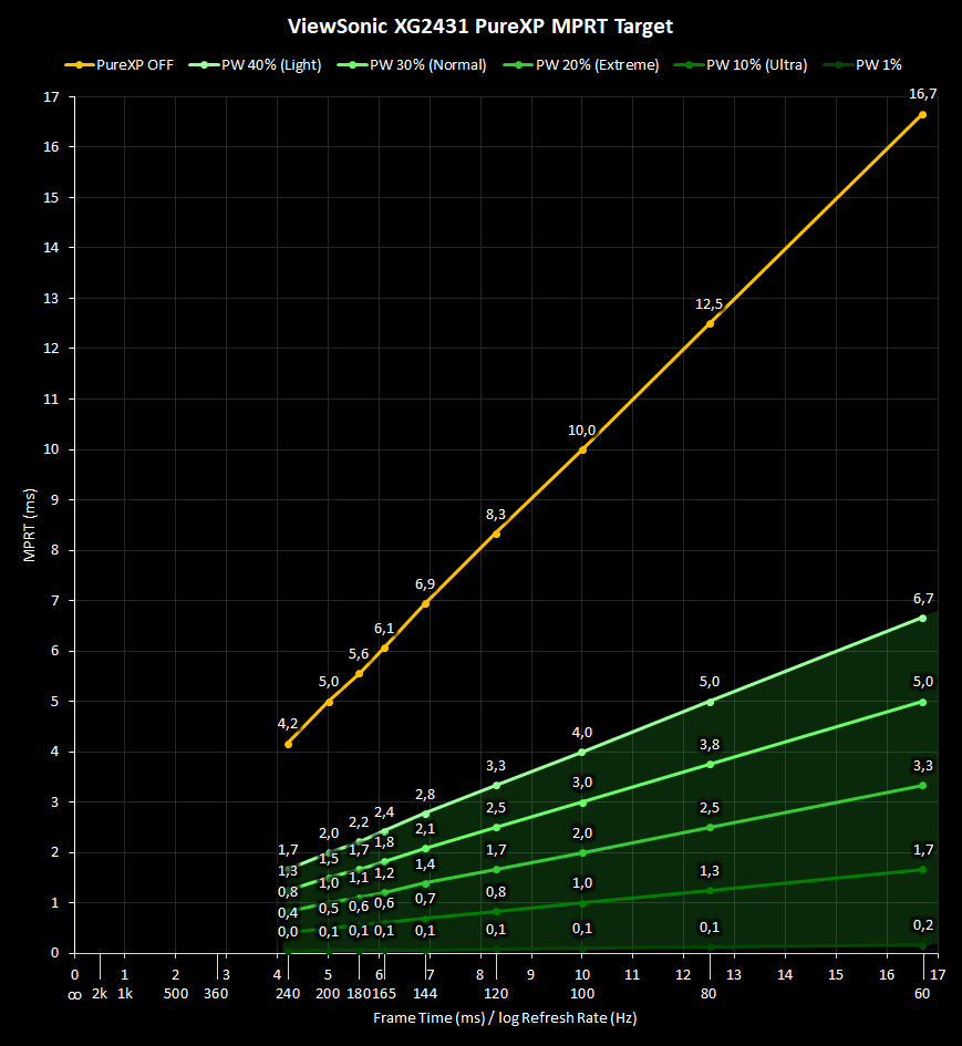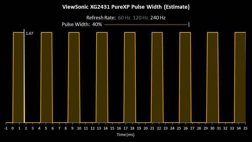 At 240 Hz XG2431 targets 0.04 – 1.67 ms, while at 60 Hz 0.17 – 6.67 ms pulse.