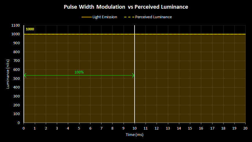 If we know how bright display is at a certain duty cycle, we can accurately estimate luminance of other pulse widths with simple math and Talbot-Plateau law. Starting point would be finding out the pulse amplitude. Formula is quite simple: