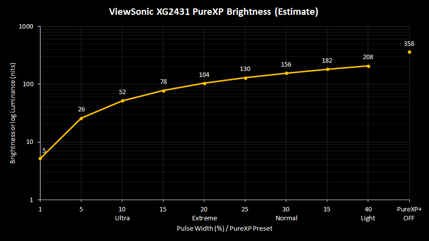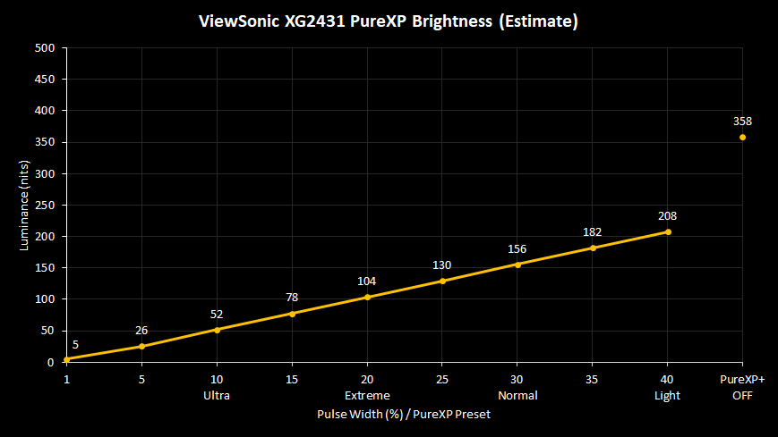 On most monitors there is some brightness hit and XG2431 is no exception. At max 40% pulse width (PureXP Light) it reaches ~208 nits, at 1% it drops all the way down to ~5 nits. Users can choose almost any brightness in-between. 1% gives or takes about 5 nits.