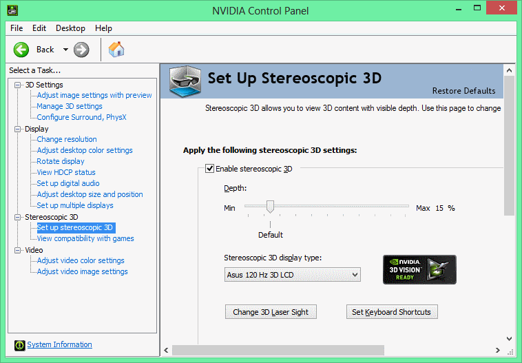 - Check “Enable Stereoscopic 3D settings for all displays” is enabled (Windows 8 only)